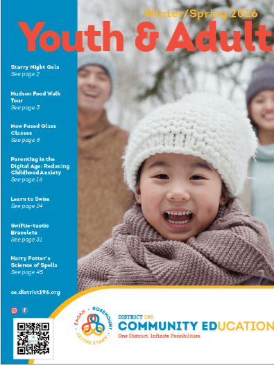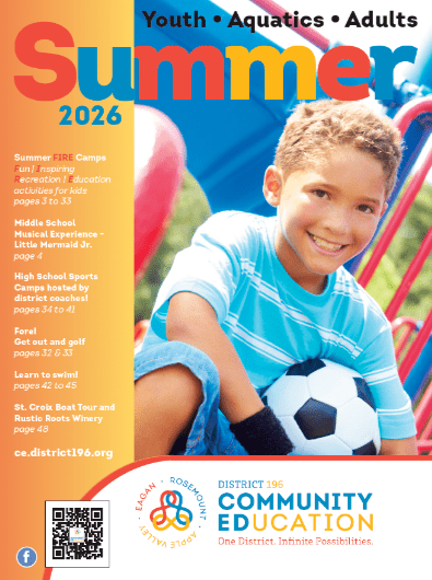The sky's the limit! Chart out a season full of fun and learning where there are infinite possibilities. The sky's the limit and we invite you and your family to be inspired, engaged and enriched with District 196 Community Education classes. Registration for Summer 2026 classes, camps and programs opens at 6:00 a.m. on Thursday, February 19.Click on the catalogs below to view classes. Adult EnrichmentYouth EnrichmentHigh School Sports CampsAfter School ProgramsAquatic ProgramsConnections Preschool (2026-2027)ECFE | Early Childhood Family EducationEarly Childhood ScreeningAdults with Disabilities (River Valley Project Explore)Facility UseGift Certificates: give the gift of learning!Partnership & Advertising OpportunitiesRegistration Policies Join Our Team!Share your passion. Share your expertise as an instructor for youth, after school and adult programming! Become a lifeguard, swim instructor or building supervisor, welcoming thousands of residents into our schools! Adult EnrichmentYouth EnrichmentHigh School Sports CampsAfter School ProgramsAquatic ProgramsConnections Preschool (2026-2027)ECFE | Early Childhood Family EducationEarly Childhood ScreeningAdults with Disabilities (River Valley Project Explore)Facility UseGift Certificates: give the gift of learning!Partnership & Advertising OpportunitiesRegistration Policies Watch Our VideoTo search for classes, use one of the following methods: Enter a keyword(s) into the search bar and find the class of your choice. Click on the magnifying glass and search by any combination of time, days, start date, category, age/grade, location and more! Have a night free? Choose a date and see what engaging learning opportunities we have for you!Know the instructor's name? Enter their name into the search bar to find all classes taught by that instructor.If you have not ever registered for any of our classes, you will need to create a new account in order to register for classes. Please click on log in box in the upper right corner and then select create account to begin the process. Once you have entered all account information, you will receive a validation email to confirm your use. We look forward to hearing from you!Please refer to the FAQs for more information and cancellation procedures. Nondiscrimination NotificationPrivacy StatementVocational Opportunties NotificationCopyright Notice 2026 Summer CatalogClasses, camps and programs for Youth, Adults and Families. 2026-2027 Connections Preschool Preschool for children ages 3 and 4 years old. 2026 Spring ECFE Catalog Classes for parents and their children ages birth through prekindergarten. Some classes go through 6 years old. 2026 Winter/SpringCatalogClasses for Youth, Adults and Families. Classes run from January until June. 2026 Winter Project Explore CatalogWinter classes and programs for Adults with Disabilities. 2026 Spring Project Explore CatalogSpring classes and programs for Adults with Disabilities.